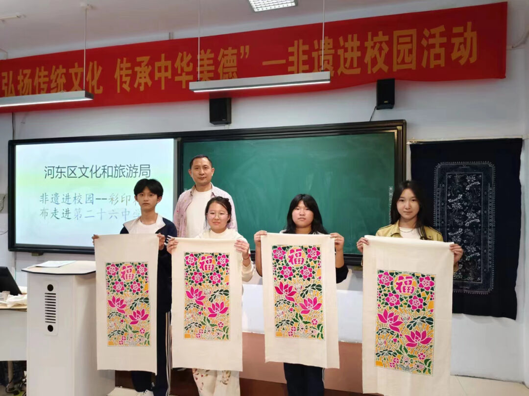 今日河东区文化和旅游局组织省级非遗项目“彩印花布”走进临沂第二十六中学,开展非遗进校园活动。