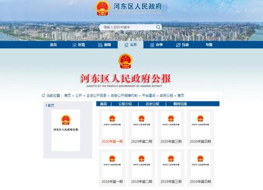 分类发布区政府文件、区政府办公室文件、规范性文件,做好已公开政府信息规范管理;进一步增强政府公报服务效能。设置政府公报专栏,方便群众随时随地查询、收藏所需政策和相关政策解读。将2019年创刊以来的所有《河东区人民政府公报》全部分类入库,截至2020年年底,已发布《河东区人民政府公报》共8期。